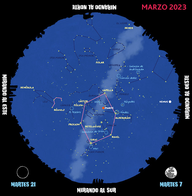 Aquí van las recomendaciones para echar un vistazo al cielo nocturno de marzo con su planisferio correspondiente. Son indicaciones para las primeras horas de la noche.